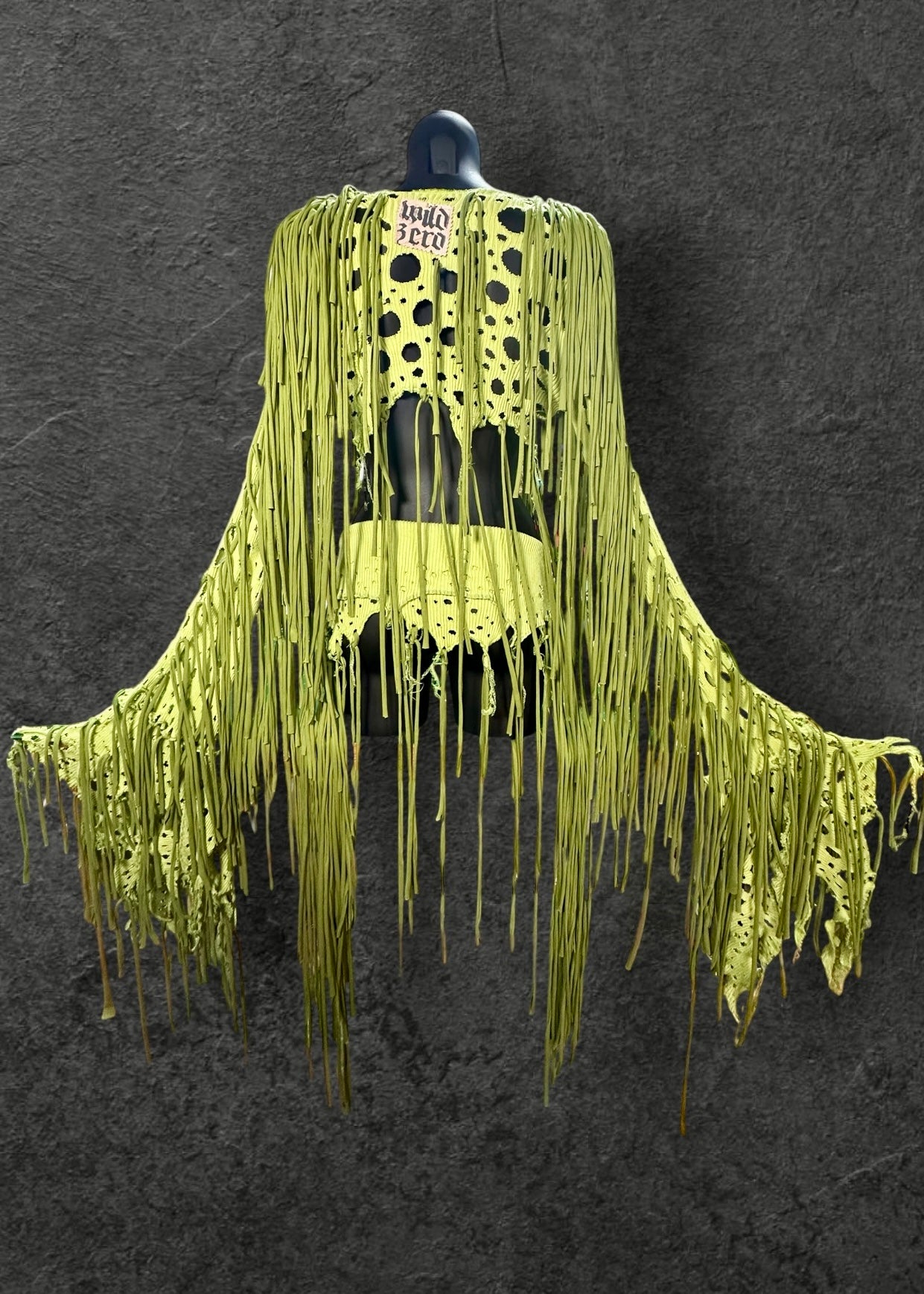 Amazing and dramatic Wasteland set in pistachio green shades. Reworked, distressed and tattered with overlock stitching, white metal star studs and long draping ties.