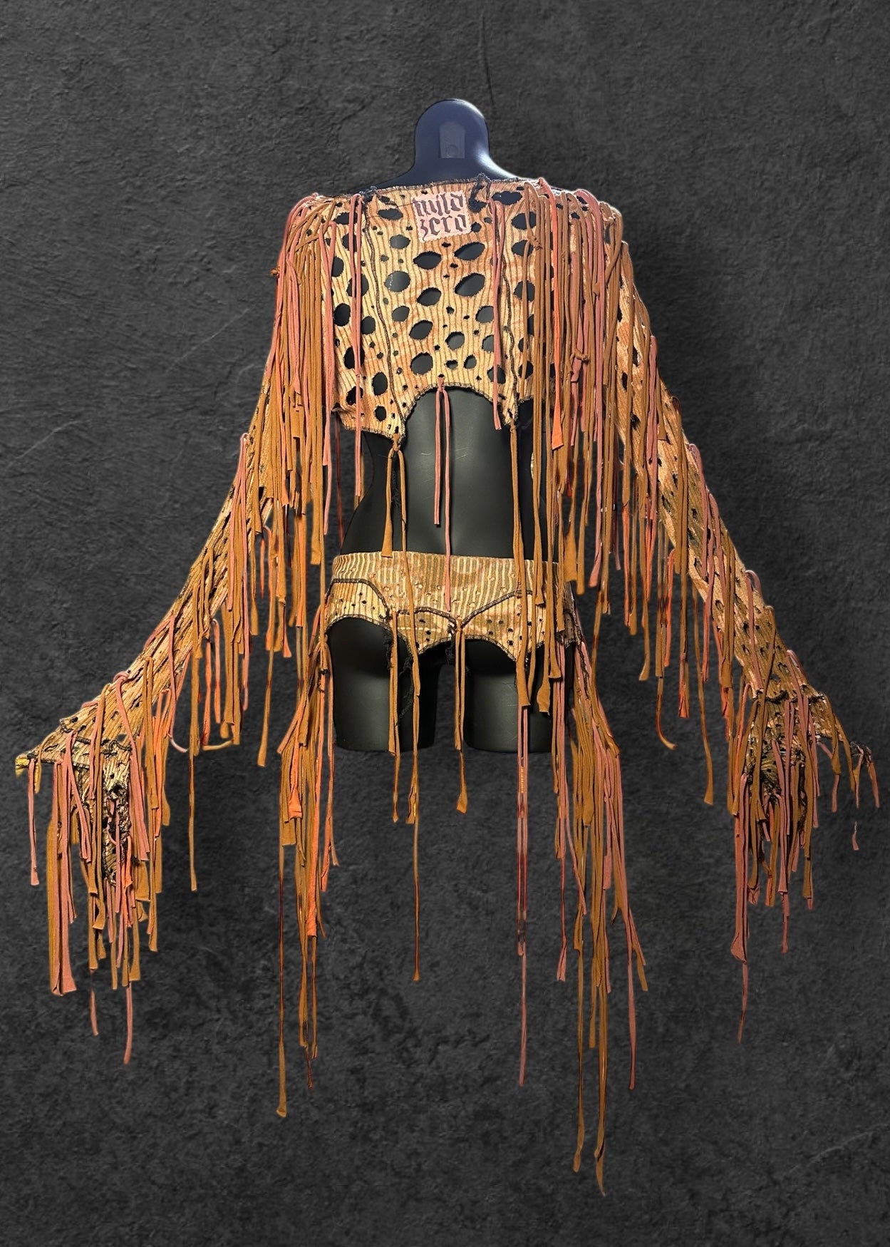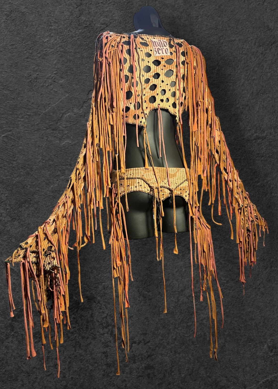 Amazing shredded, tattered bleached out rusty orange to taupe/dusty pink stretchy rib knit grunge crop top & belt skirt set rave outfit with ragged holes, metal star studs and long draping ties.
