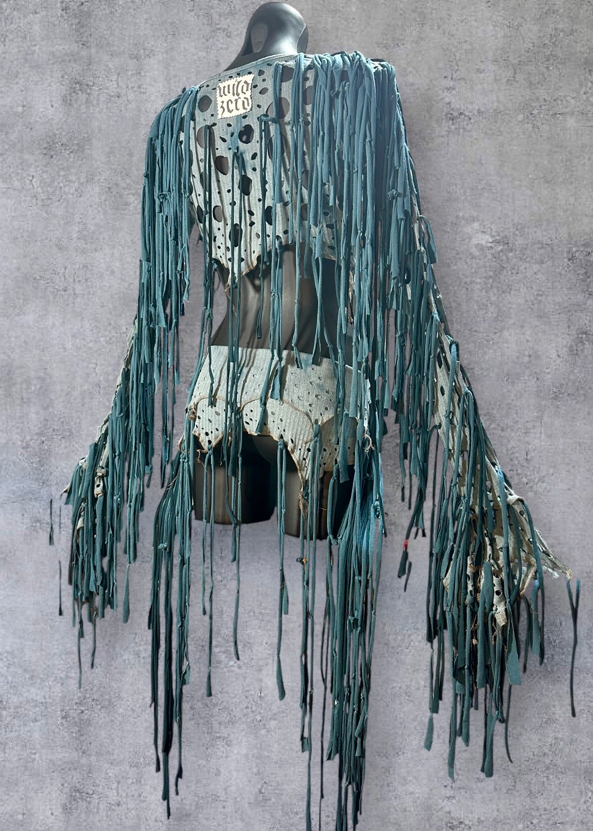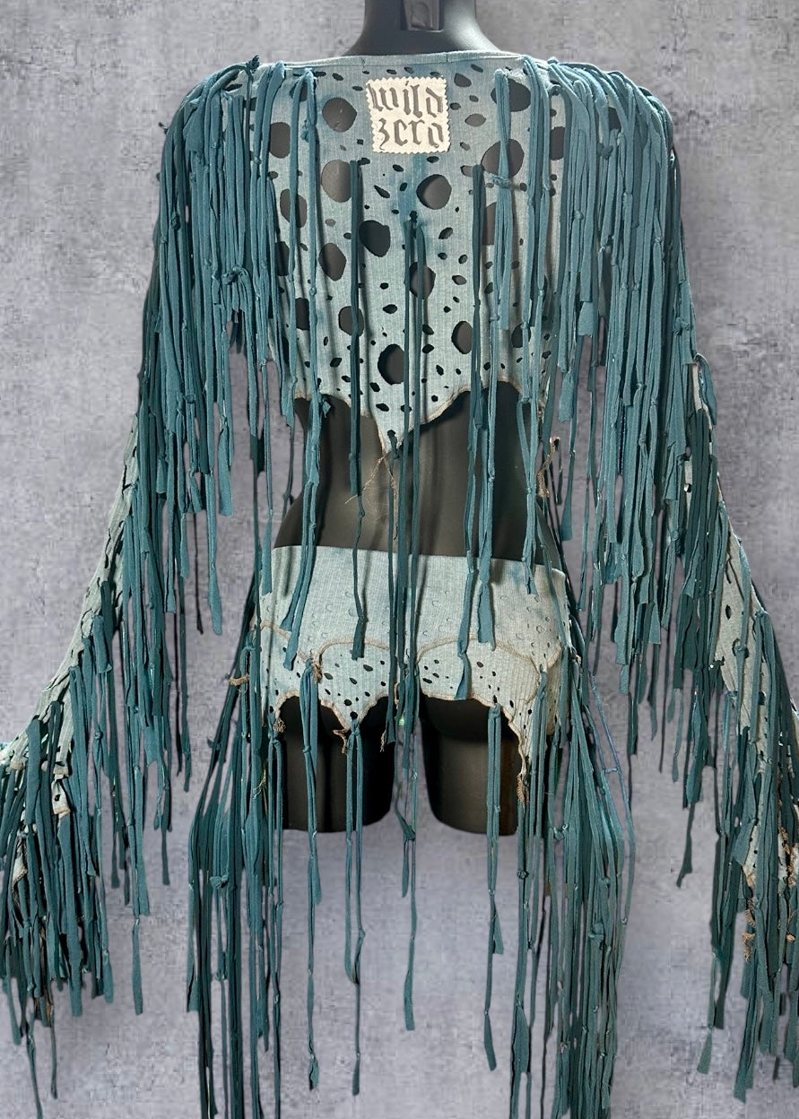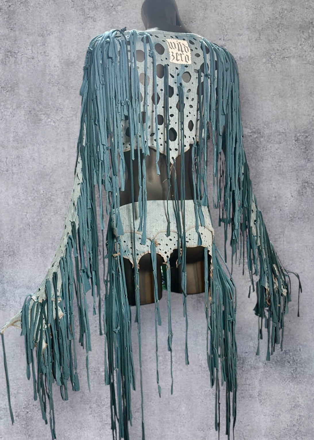 Amazing reworked Wasteland set, tattered and distressed with raw cut holes, metal star studs and long draping ties.