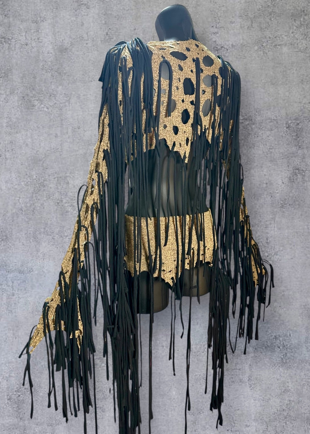 Reworked tattered and distressed Wasteland set in mustard marl rib knit. Black star studs, ragged knit holes left raw edged and long black draping ties.