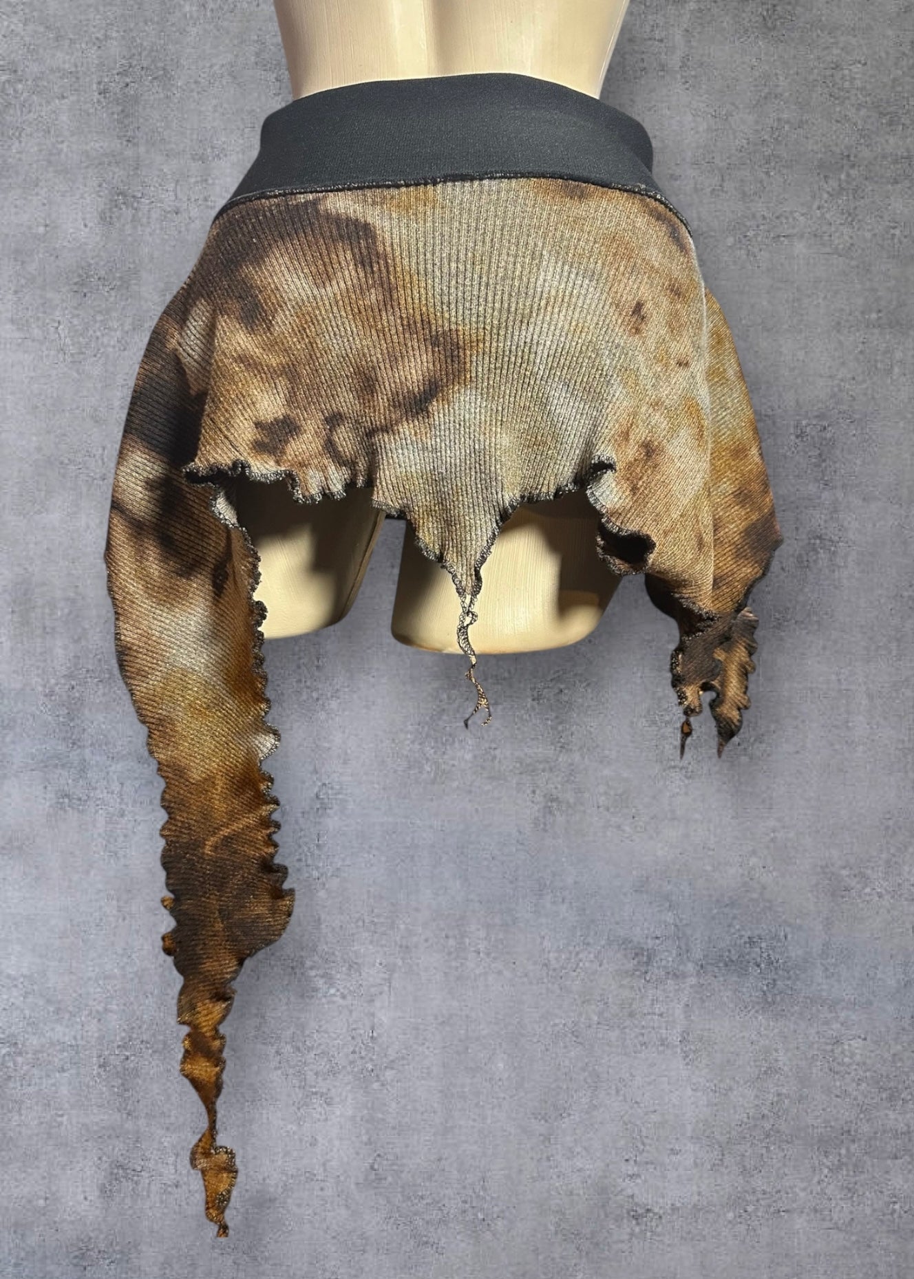 Awesome bleached out asymmetric reworked knit fabric skirt with overlocked lettuce hem and stretchy wide waistband.