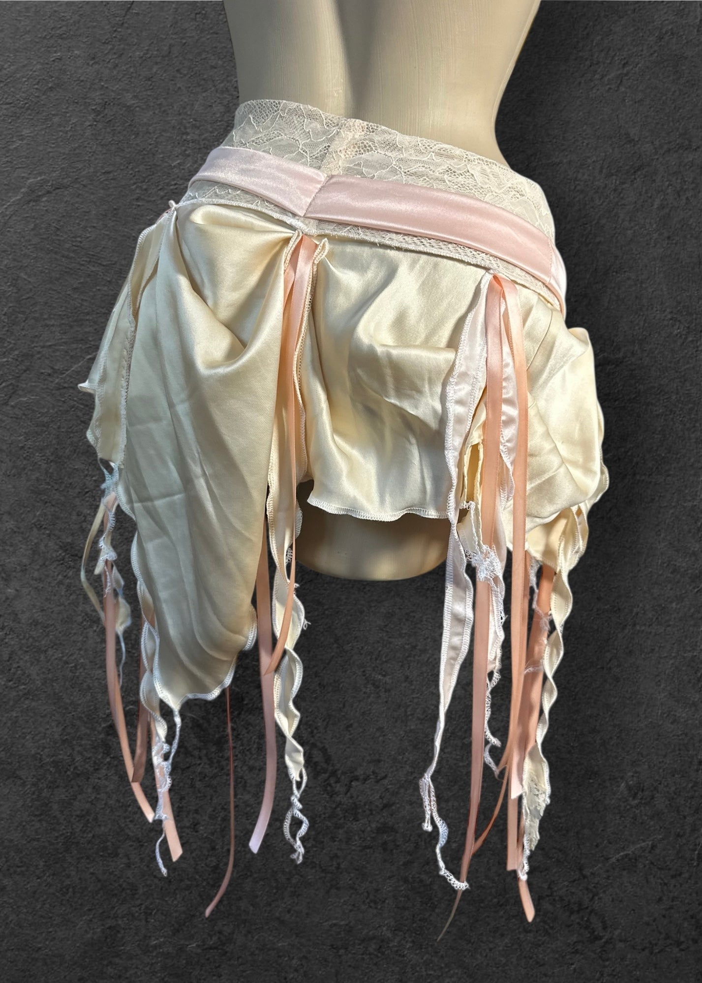 Stretchy lace waistband can be worn folded over to create a more low rise or shorter look. A soft satin peach sash ties around the waistband.