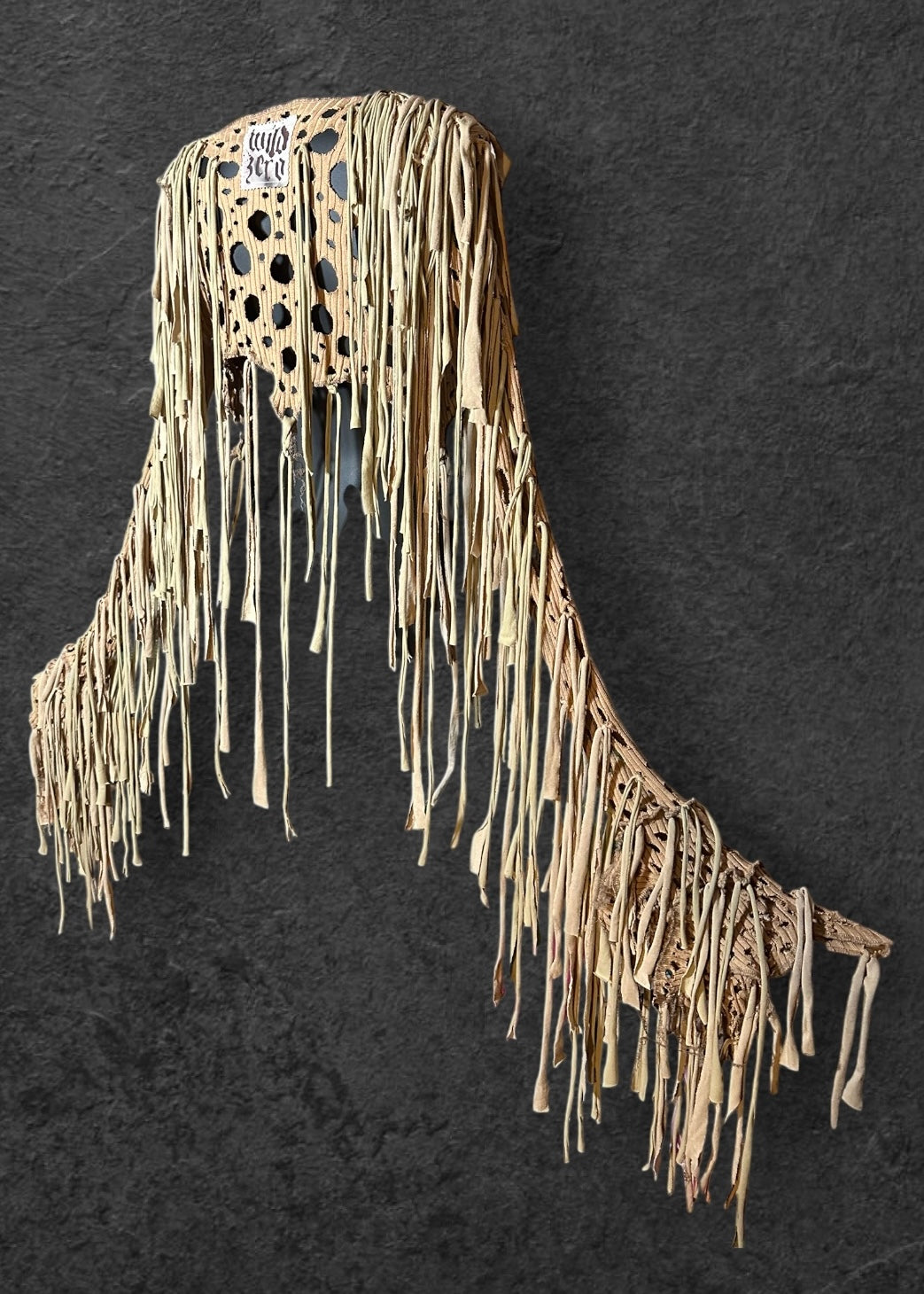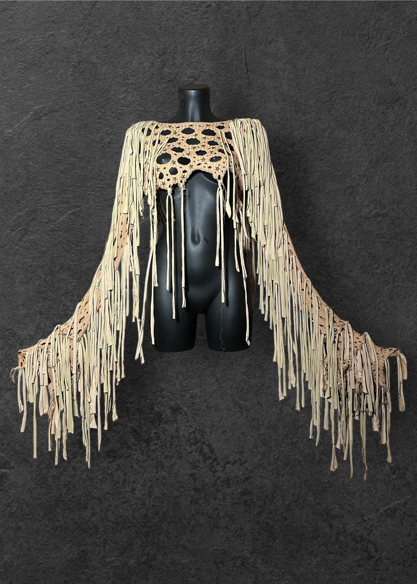 Stunning reworked 1 of 1 Wasteland top in soft sandy beige tones. Ragged distressed style with cut out holes, brass metal star studs and long draping boho fringe ties.