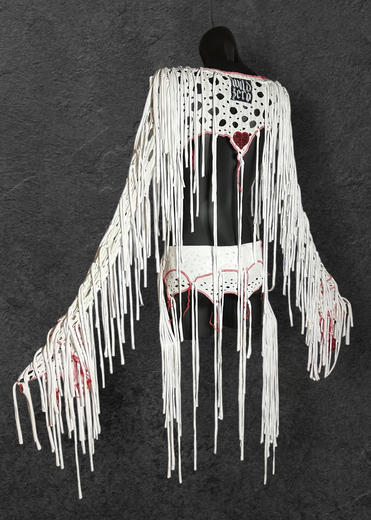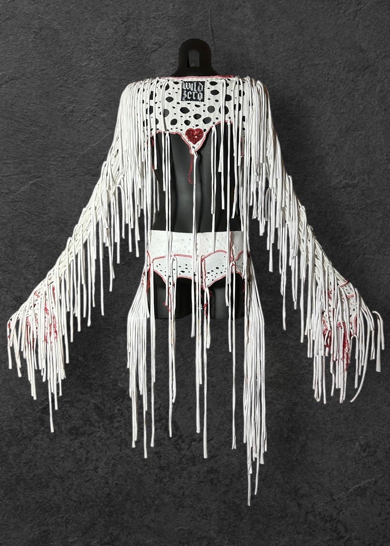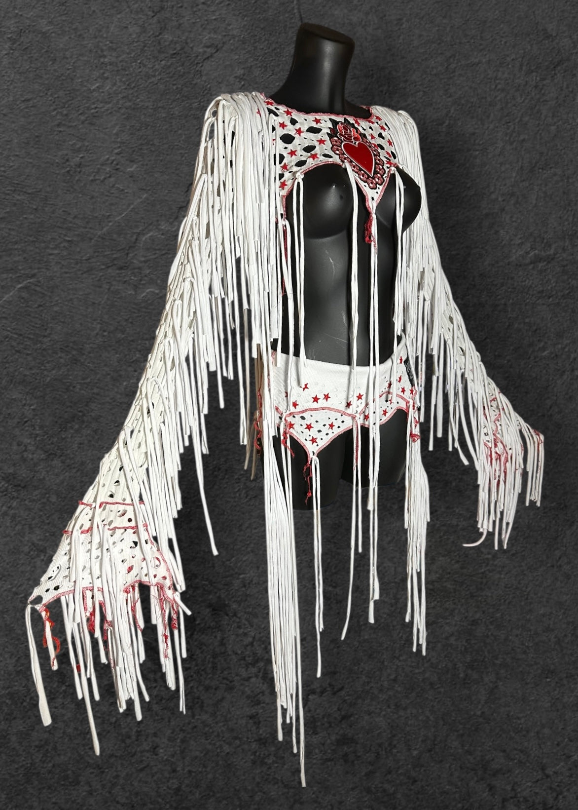 Fabulous circus inspired white reworked rib knit ultra crop top overbust with plunging V front and back, red heart motifs, ragged cut out holes, red contrast overlock stitching, red star studs and long white draping ties.