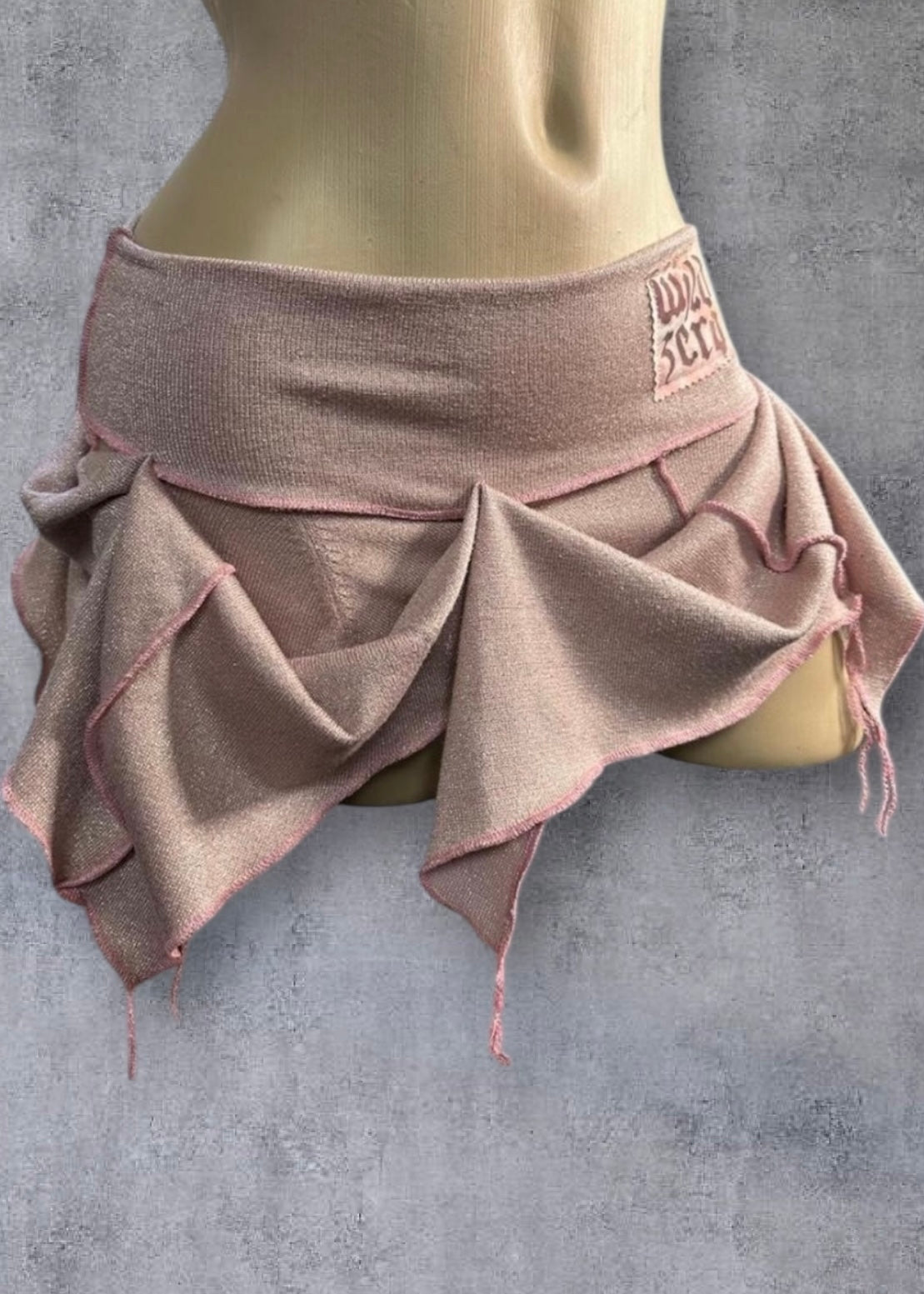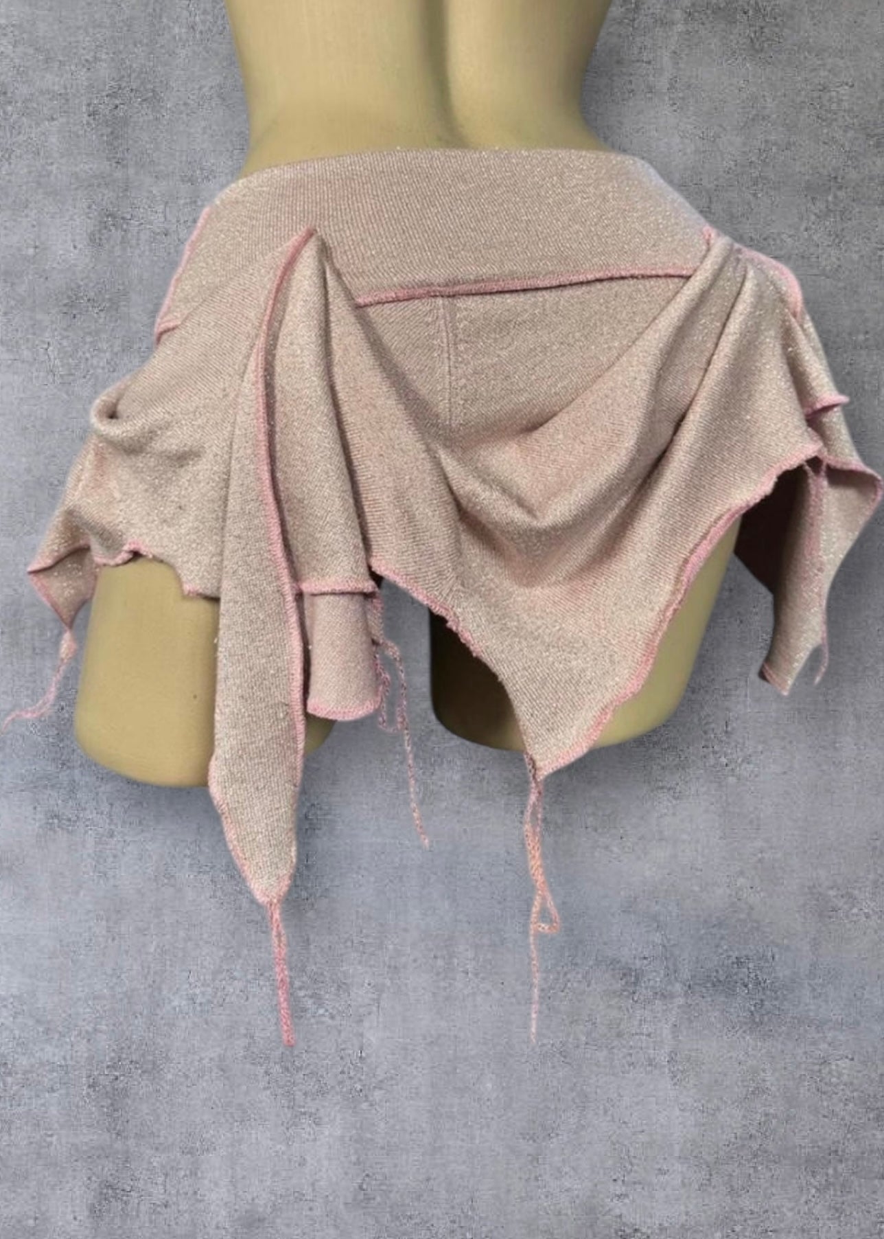 Shimmering pastel pink micro mini hitch bustle skirt. asymmetric hem edged with overlock stitching & dangling threads for a deconstructed vibe. Reworked from a pre loved knit, one of a kind. Stretchy deep waistband.