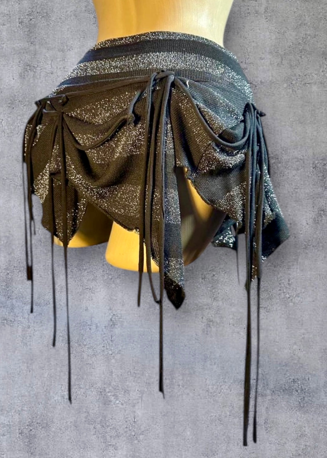Funky black & silver Lurex stripe asymmetric handkerchief bustle hitch skirt with long draping jersey ties.