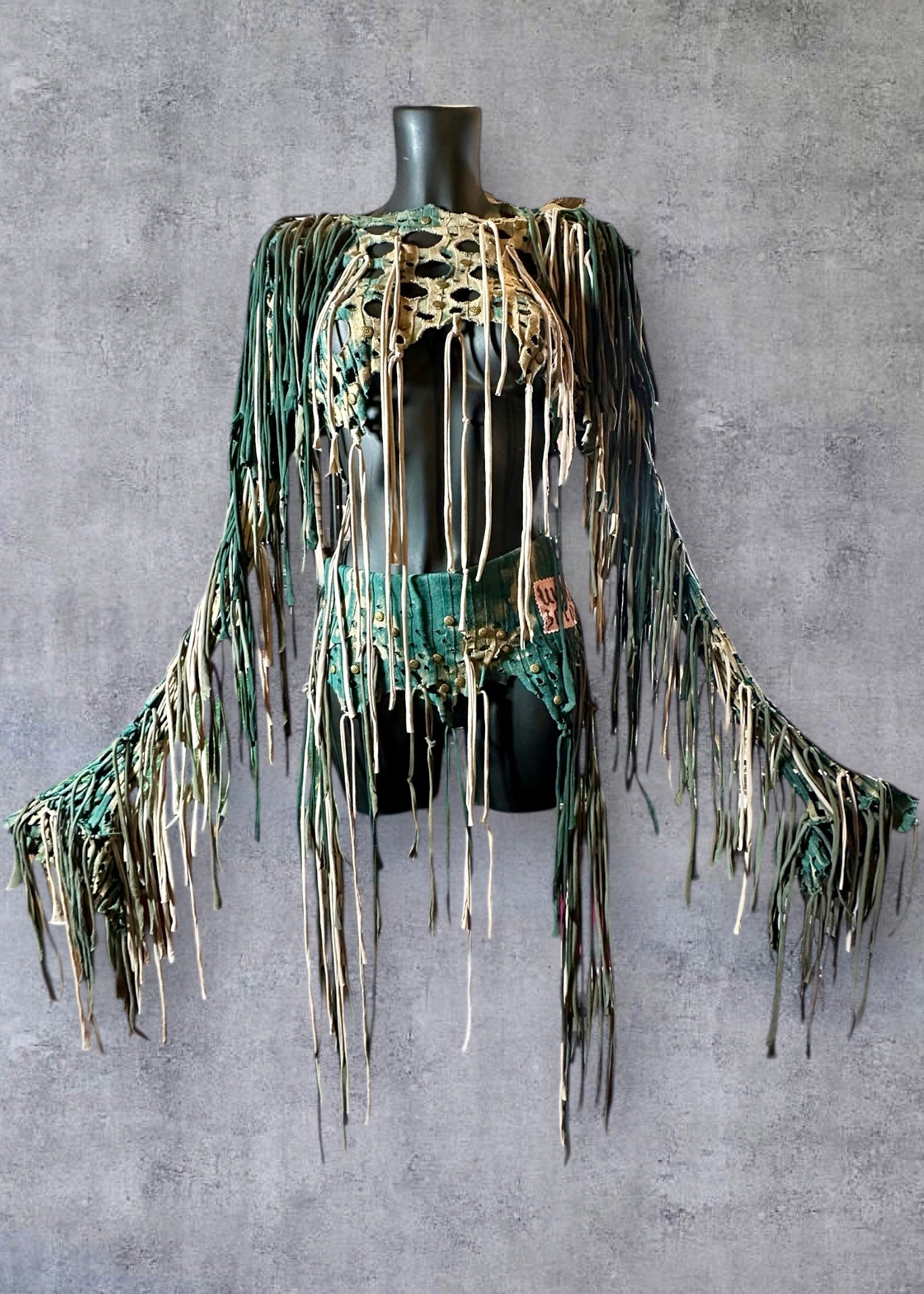 Amazing shredded, tattered bleached out green to taupe/dusty beige colour stretchy rib knit grunge crop top & belt skirt set rave outfit with ragged holes, metal star studs and long draping ties.