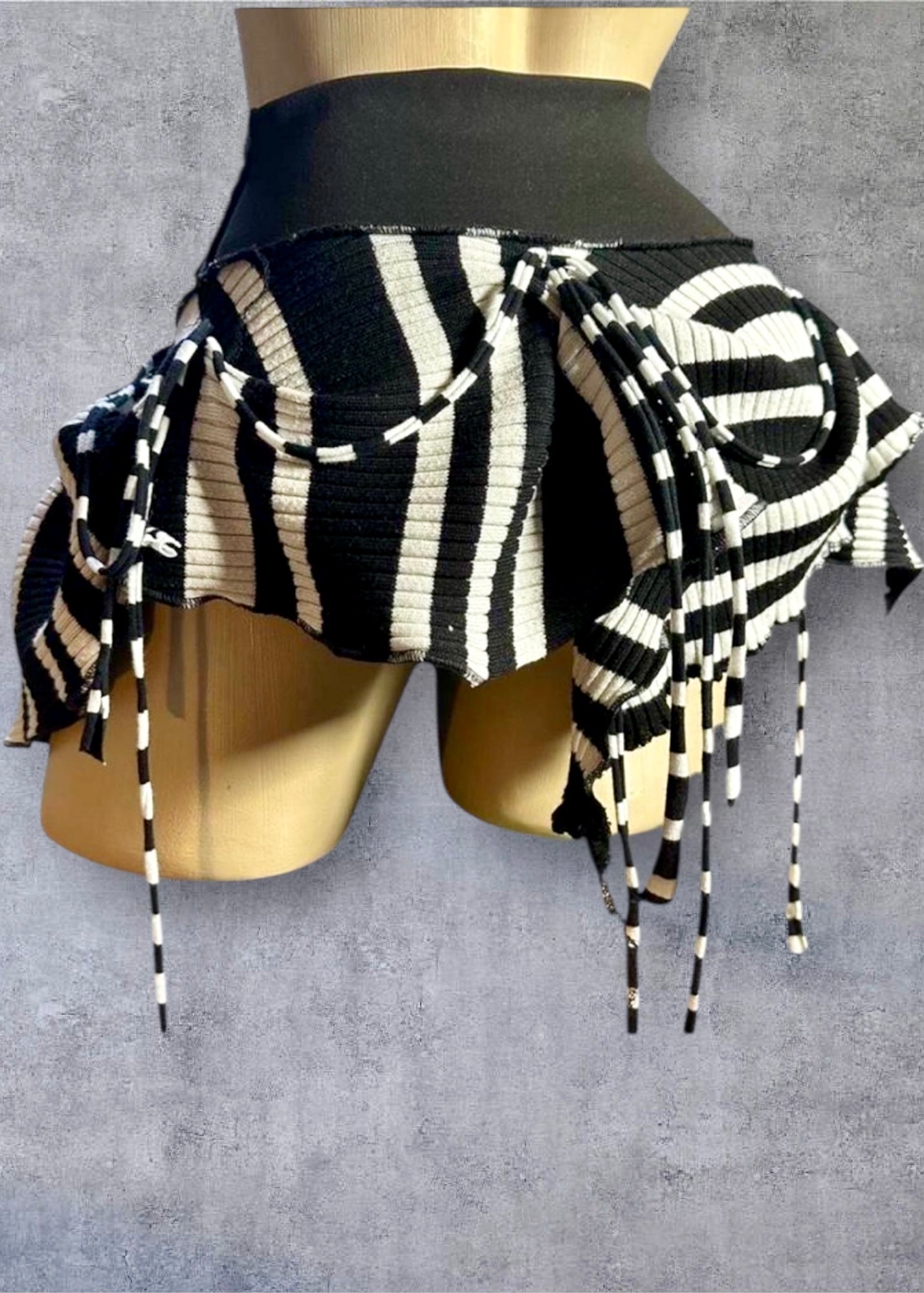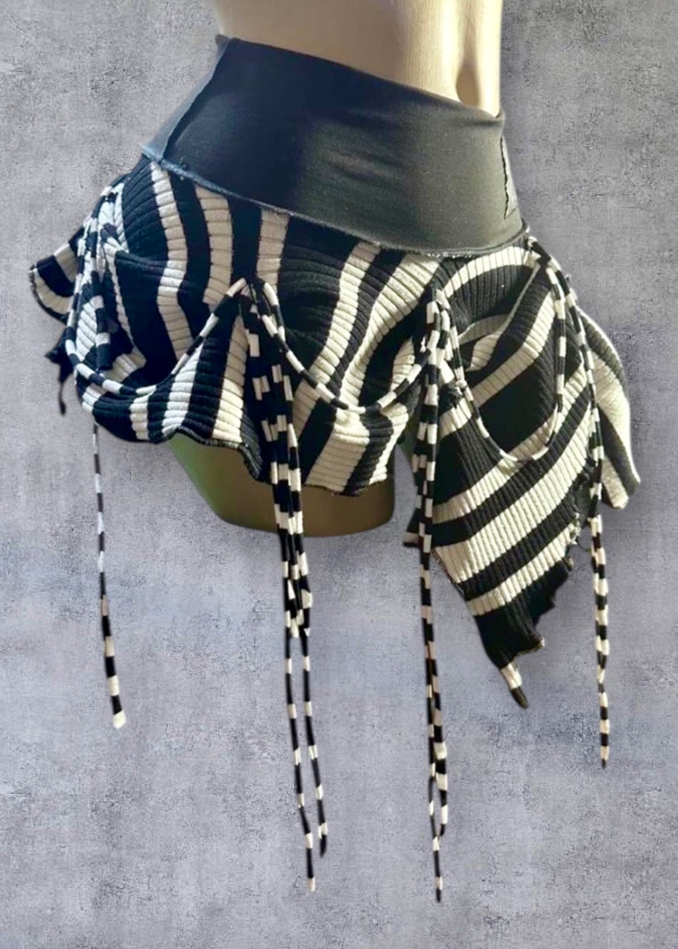 Funky gothic grunge black & white stripe asymmetric handkerchief bustle hitch skirt with long draping jersey ties. Reworked from a pre loved knit and t shirt.