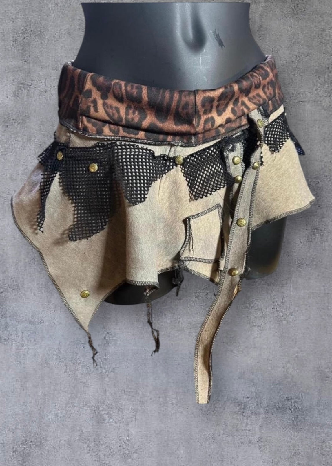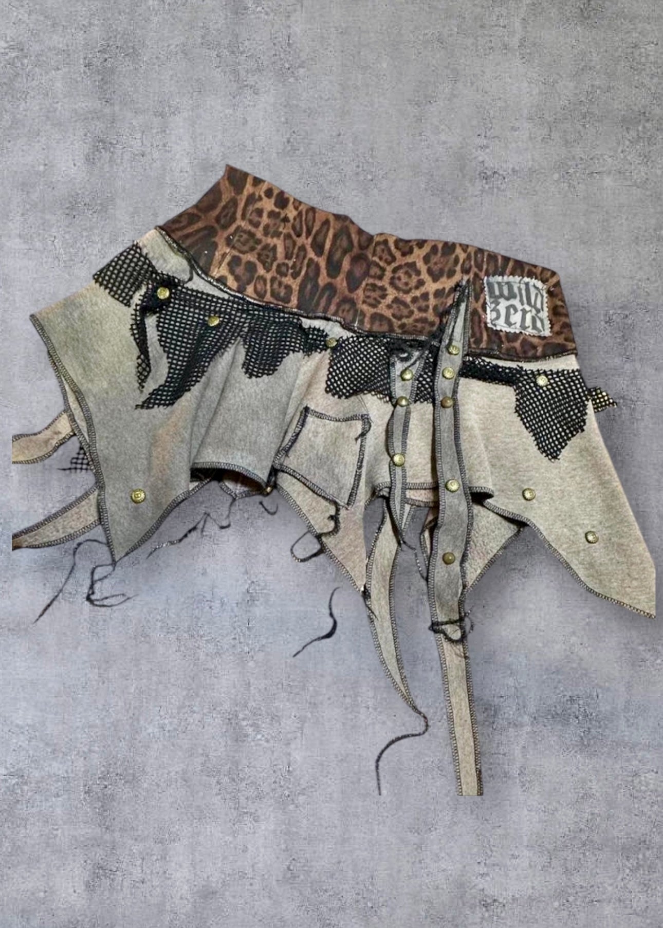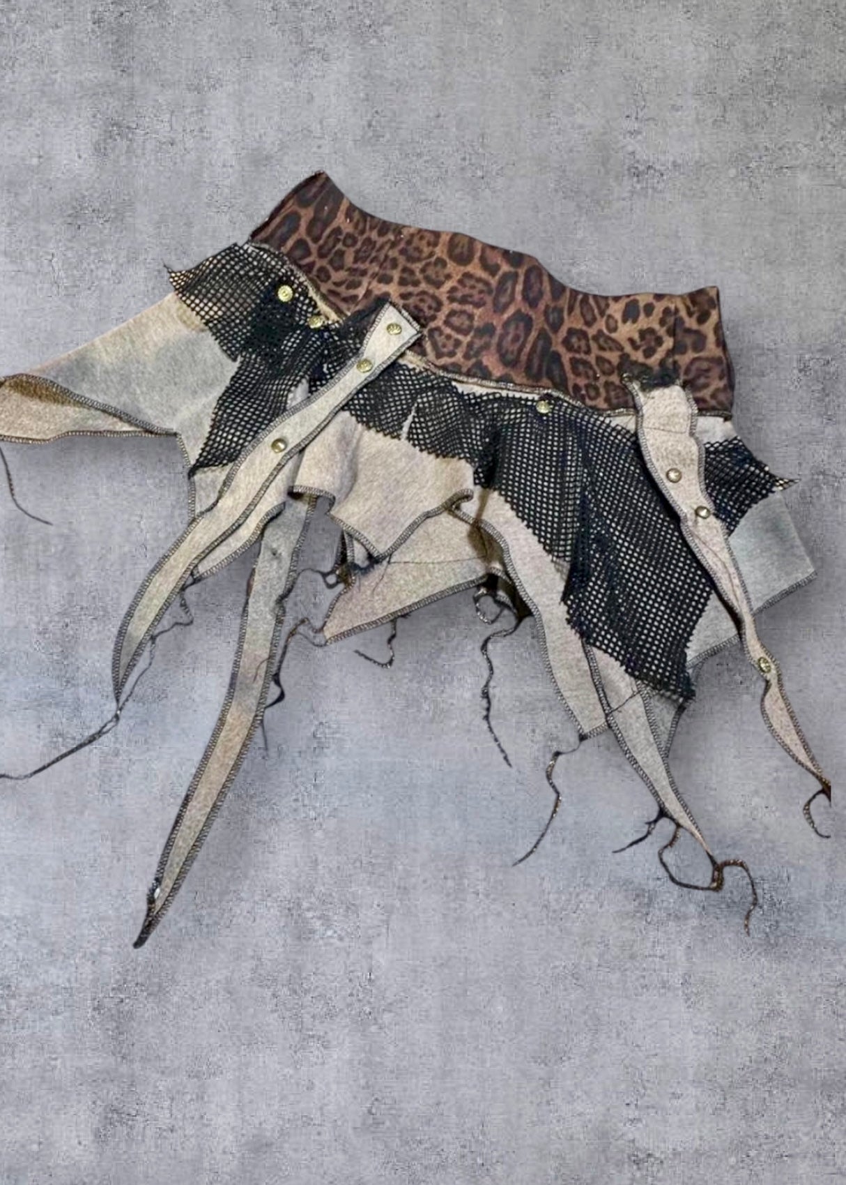 Stretchy leopard print waistband, over locked stitching, bleached out jersey, black mesh, asymmetric handkerchief hem and metal studs.