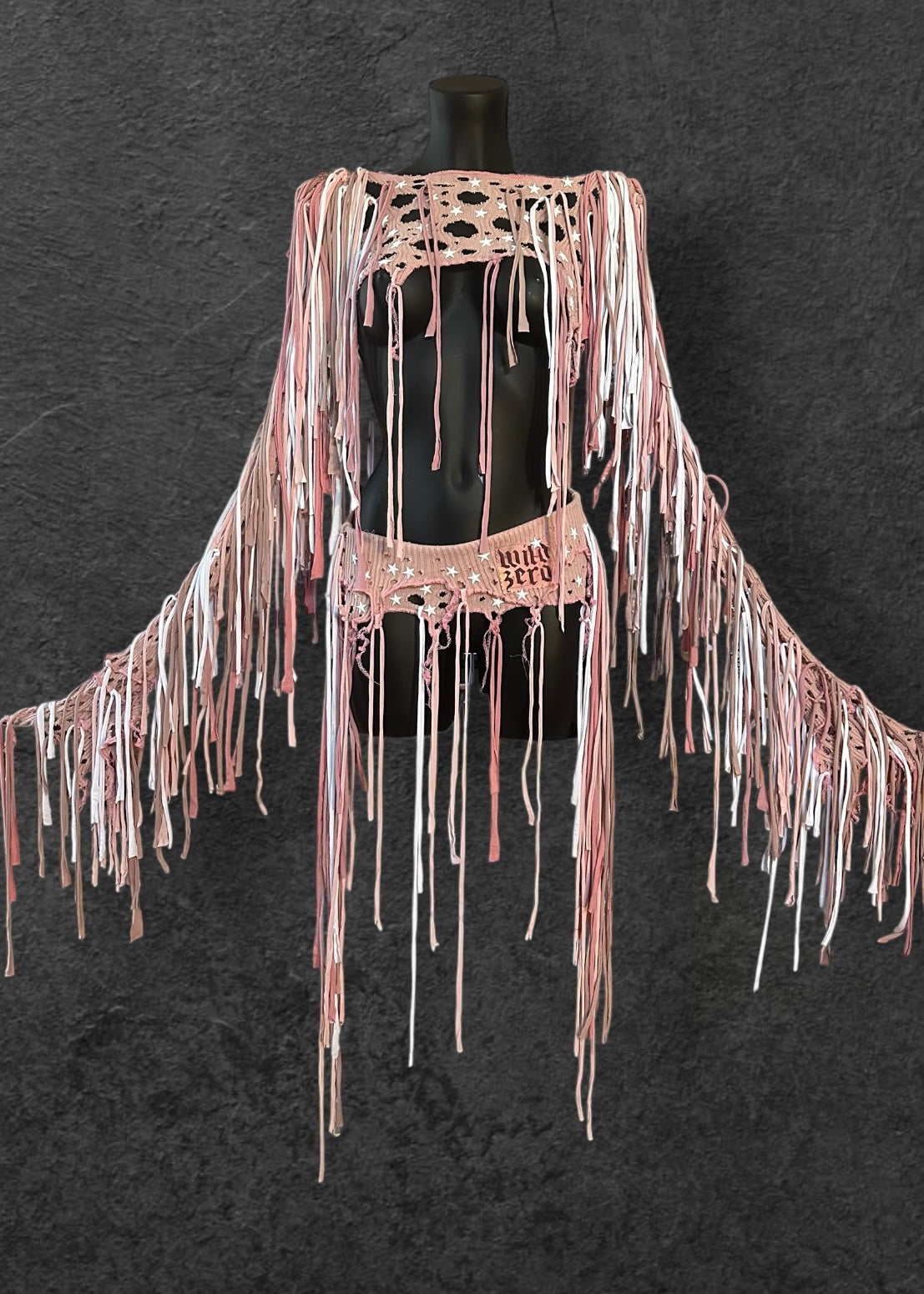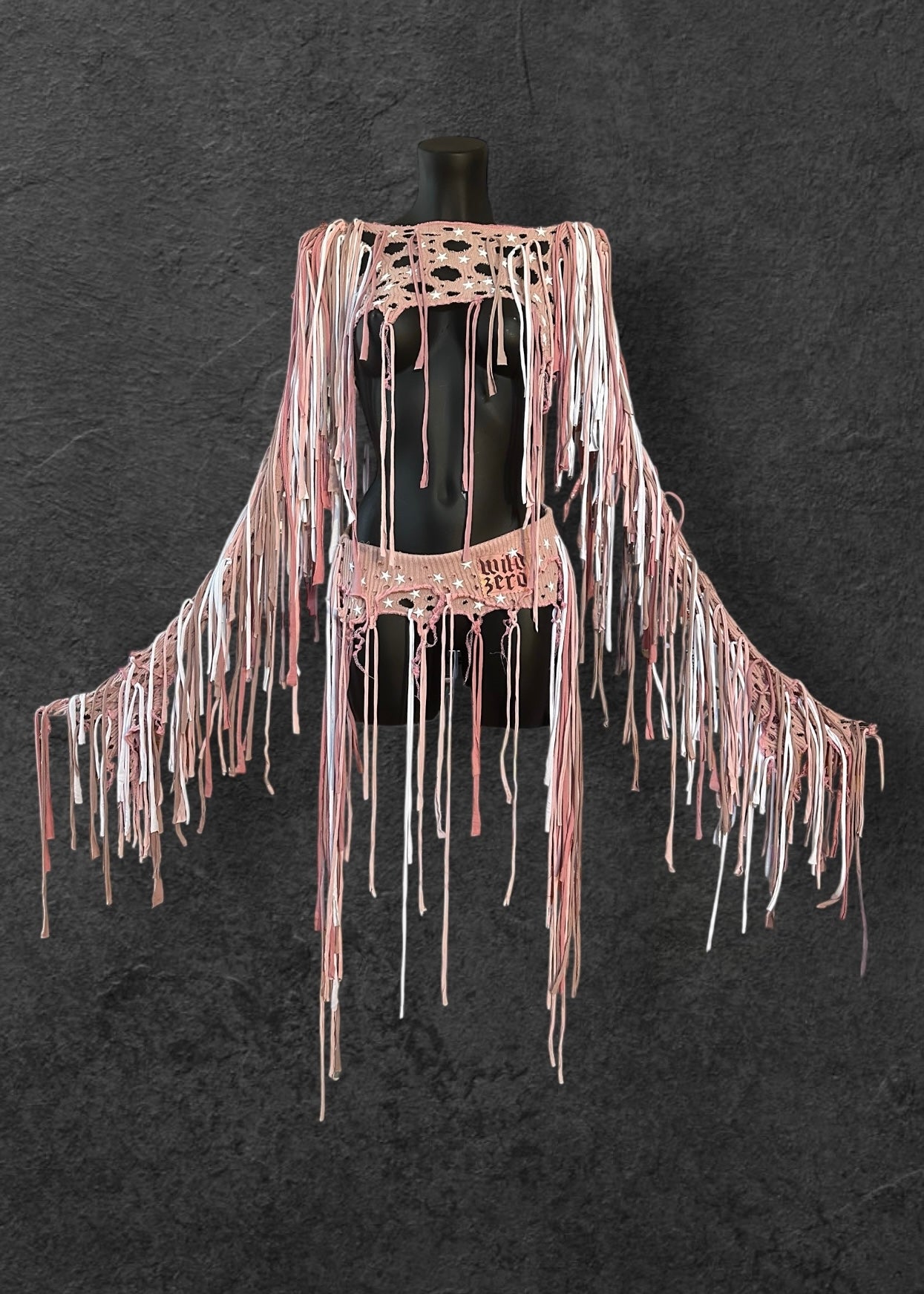 Amazing shredded, tattered dusty pastel pink stretchy rib knit grunge ultra crop top & belt skirt set rave outfit with ragged holes, white star metal studs and long draping ties in pinks and white. Pink overlock edging.