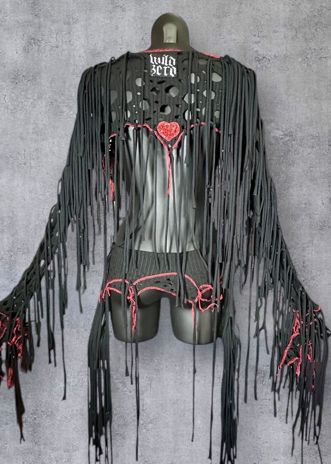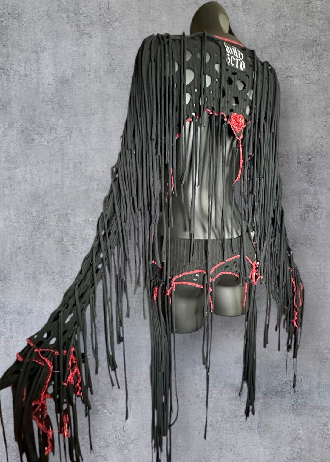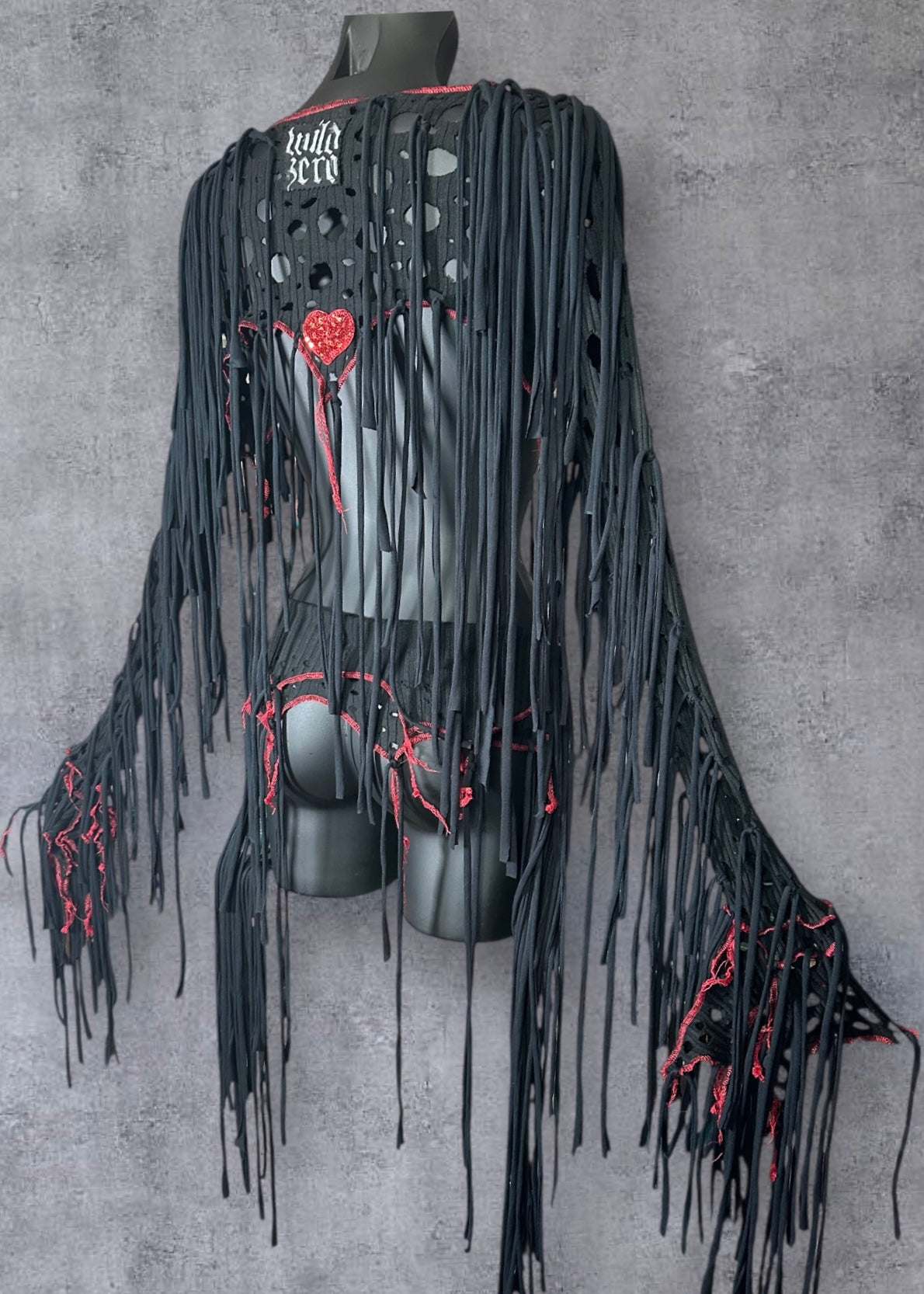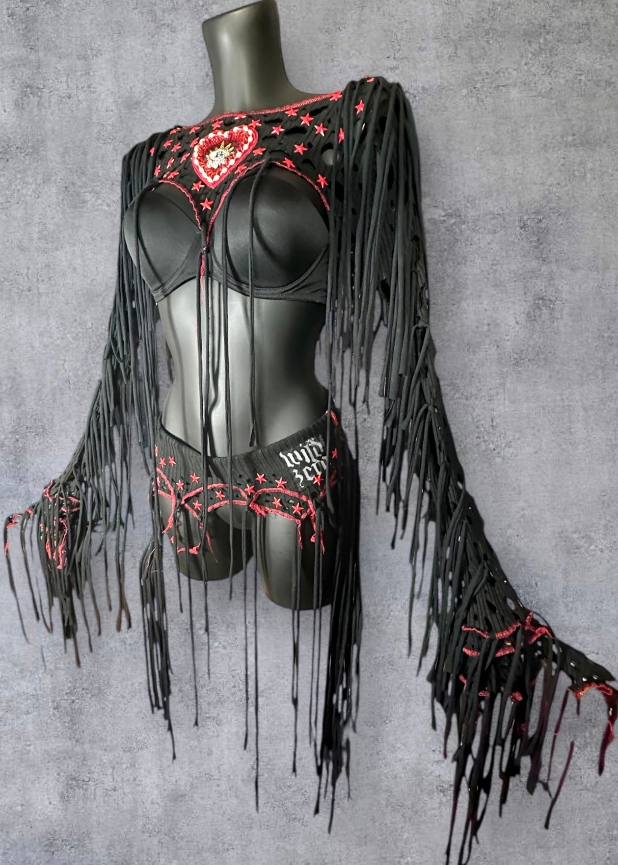 Fabulous circus inspired black reworked rib knit ultra crop top overbust with plunging V front and back, beaded & sequin heart motifs, ragged cut out holes, red contrast overlock stitching, red star studs and long black draping ties.