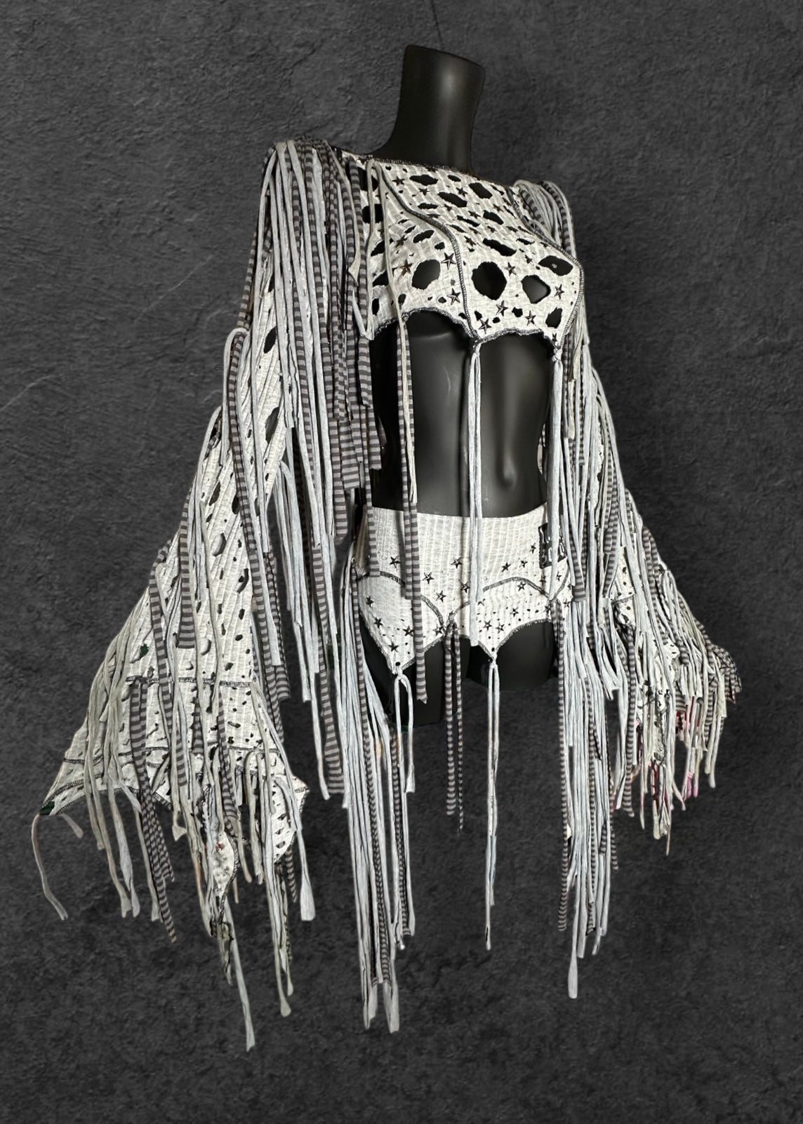 Amazing shredded, distressed & tattered light grey stretchy rib knit grunge crop top & belt skirt set rave outfit with ragged holes, metal studs and long draping ties in grey and stripy jersey.