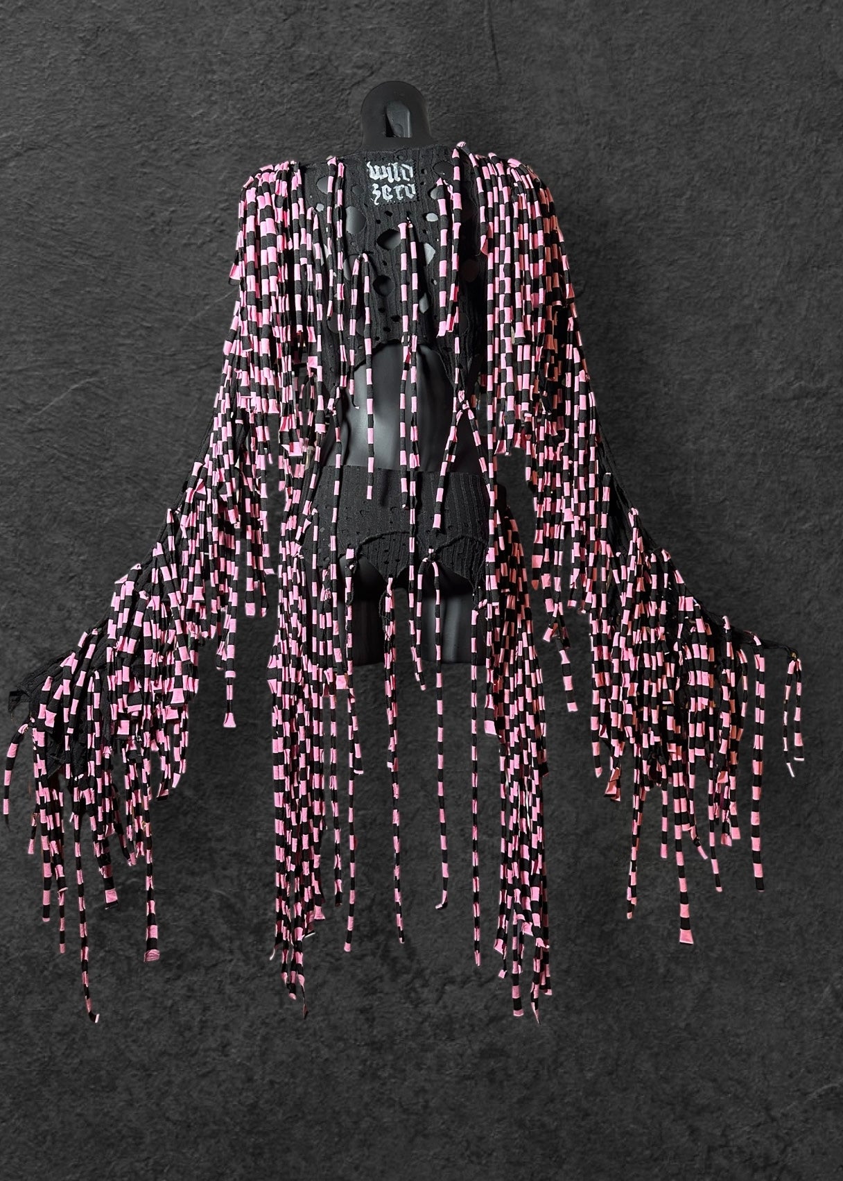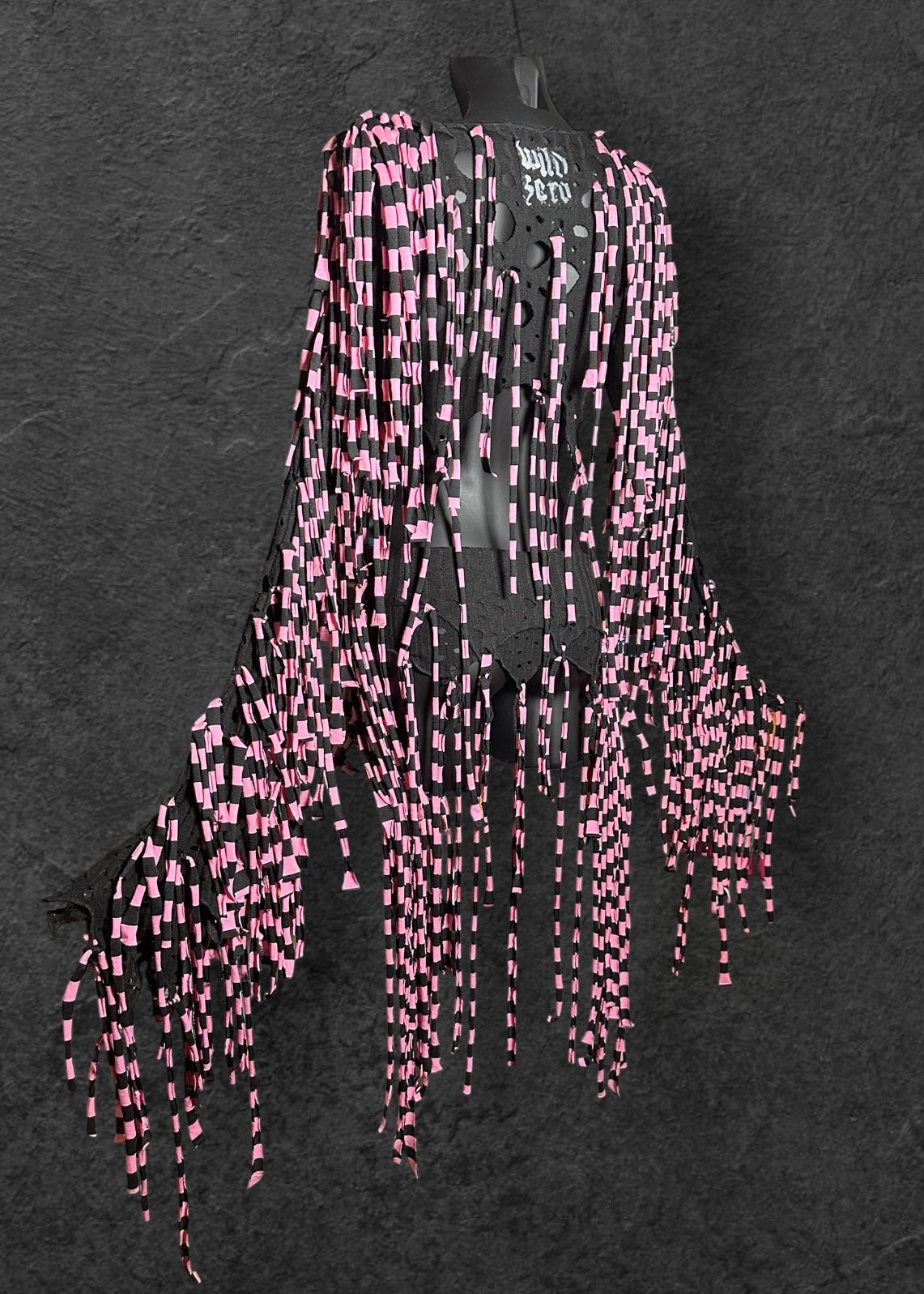 Amazing reworked shredded, tattered black grunge crop top & belt skirt set rave outfit with ragged holes, pink metal star studs & long pink & black striped draping ties.