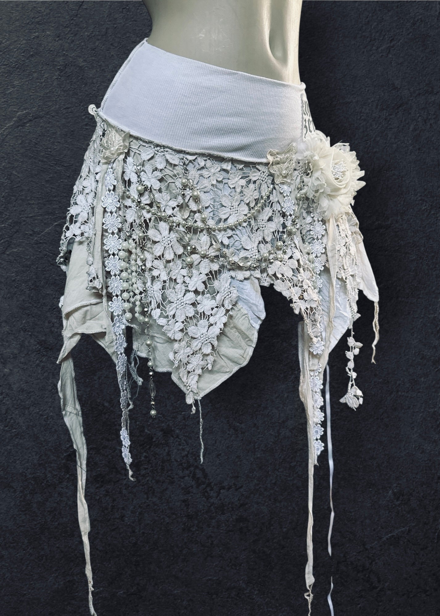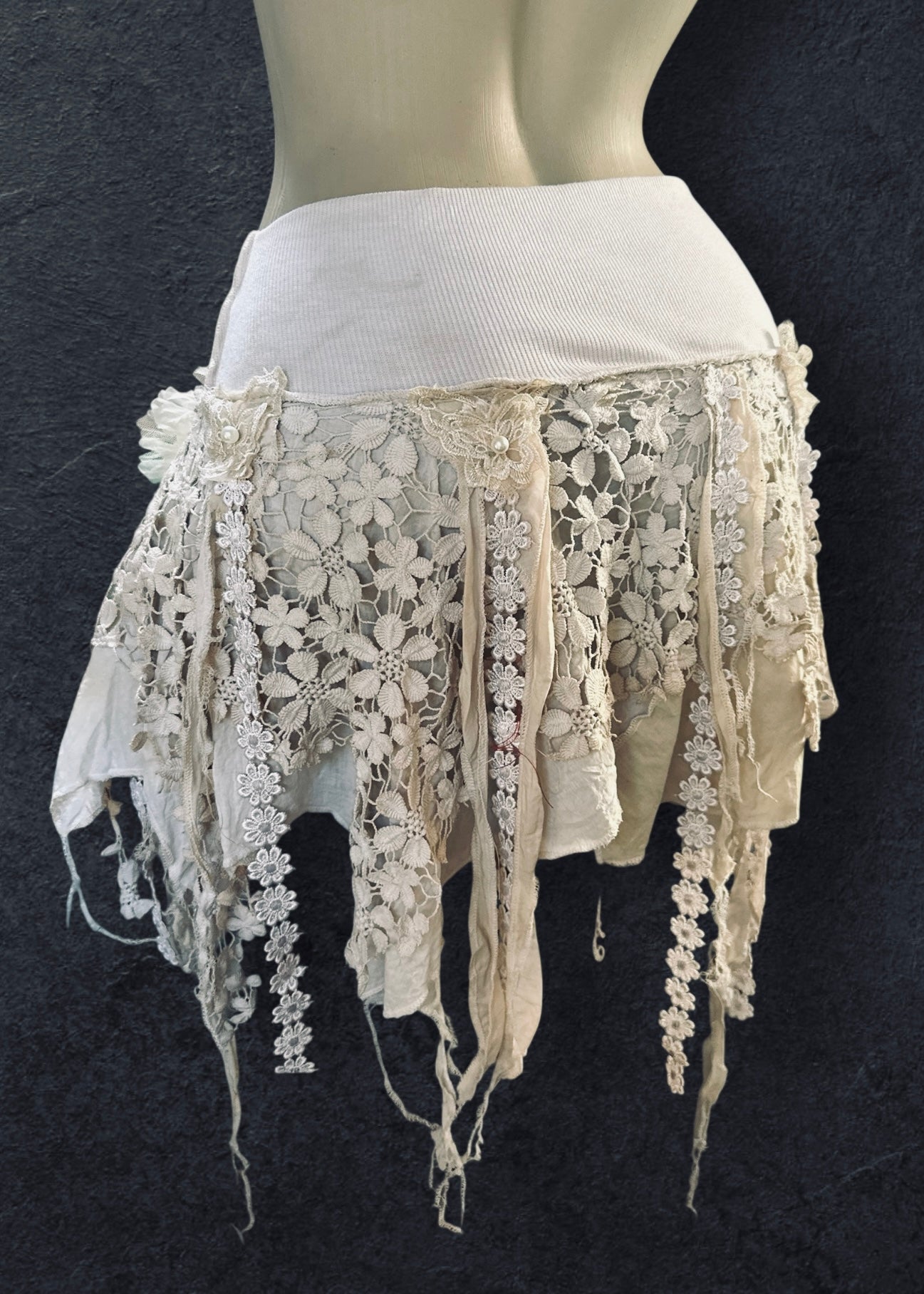 Awesome reworked tattered shipwreck skirt in upcycled vintage tea stained ragged crochet  lace with cotton underlay.